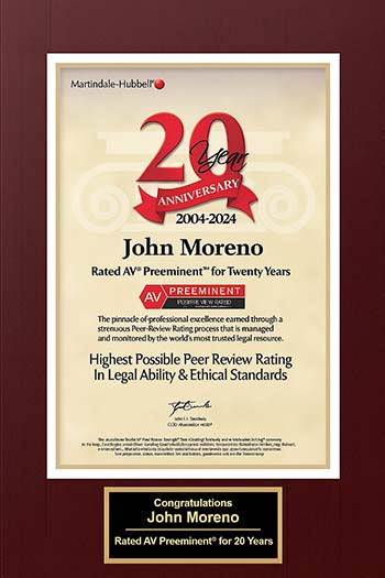 John J. Moreno has successfully handled thousands of serious injury and death cases caused by auto accidents, rollovers and defective seatbelts, motorcycle, railroad and trucking/big rig accidents, bicycle accidents, boating/personal water craft accidents, dog bites/animal attacks, malfunctioning equipment, medical devices or consumer goods, product liability, premises accidents, construction accidents, brain and head injuries, drunk driver accidents, uninsured/under-insured cases, unsafe premises accidents, construction site accidents, drunk driving accidents, brain and head injuries, food contamination claims, wrongful death, including death caused by automobiles, trains, boats, planes, tobacco, chemicals, construction accidents, and medical negligence cases.